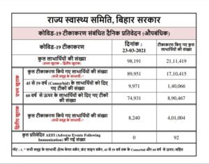 Patna : A total of 111 new Covid-19 cases were recorded in Bihar on March 22, 2021, taking the number of active cases in the state to 623 in Bihar including 300 in Patna on March 23, 2021, from 560 active cases on March 22. The tally of Covid-19 cases rose to 2,63,770 cases in the state on March 23, 2021.