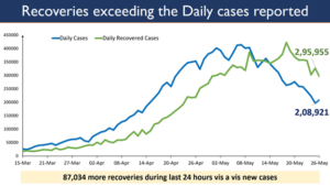 New Delhi : India’s Daily Recoveries continued to outnumber the Daily New Covid-19 Cases for the 13th consecutive day on May 26, 2021. .A total of 2,95,955 Covid-19 patients were declared cured / discharged in the country in last 24 hours to 2,43,50,816 on May 26, 2021. On the other hand, India recorded a total of 2,08,921 new Covid-19 cases in last 24 hours atking the tally to 2,71,57,795 on May 26, 2021. The recovery rate (RR) of Covid-19 patients was 89.66% in the country on May 26 from 89.26% on May 25, 2021.