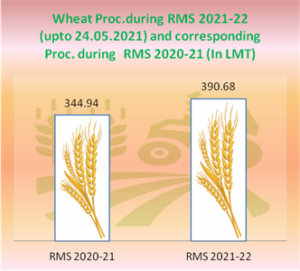 New Delhi : Procurement of Wheat in ongoing RMS ( Rabi Marketing Season) 2021-22 is continuing smoothly in the procuring States of Uttar Pradesh, Madhya Pradesh, Bihar, Rajasthan, Delhi, Himachal Pradesh, and Jammu & Kashmir at MSP, as was done in previous seasons and till now (up to May 24, 2021) a quantity of over 390.68 LMT of Wheat has been procured against the last year corresponding purchase of 344.94 LMT. About 40.81 lakh farmers have already been benefitted from the ongoing RMS procurement operations with MSP value of Rs 77,159.58 crore.