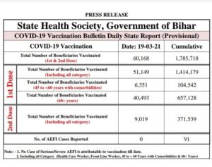 Patna : Covid-19 cases recorded so far in Bihar rose to 2,63,355 on March 19, 2021, as 90 more persons including 25 from Patna, 7 from Bhagalpur, 5 from Begusarai, 4 each from Munger, Saharsa, and Siwan, 3 each from Araria, East Champaran, Gaya, Nalanda, Nawada, and Supaul, and 2 each from Darbhanga, Muzaffarpur, Vaishali, and West Champaran, tested positive for the pandemic on March 18, 2021.