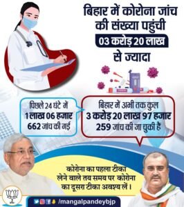 Patna : Active cases further declined to 3,188 in Bihar including 352 in Patna on June 20 as only 294 more persons tested positive for Covid-19 on June 19, 2021. The Active cases count was 3,395 in Bihar on June 19, 2021. Bihar also reported 7 new deaths due to Covid-19 in last24 hours taking the toll to 9,550 on June 20, 2021.