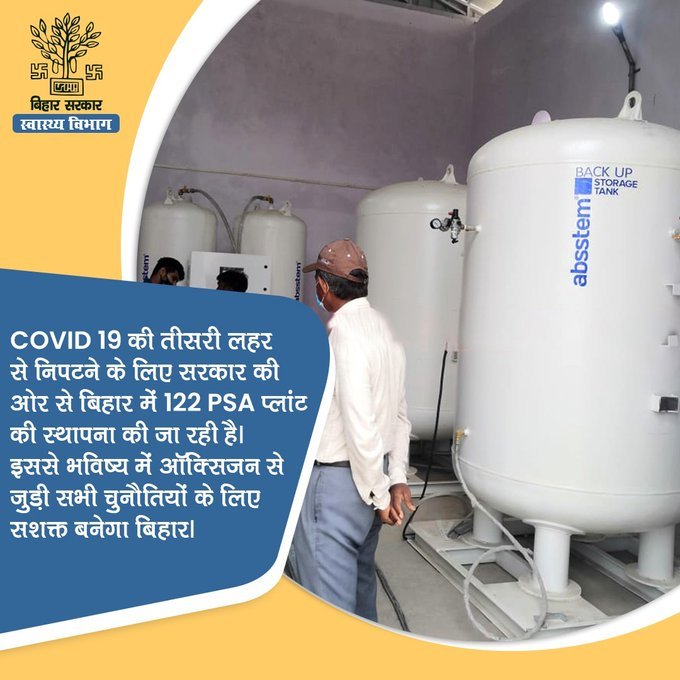 #COVID19 की संभावित तीसरी लहर से निपटने के लिए राज्य सरकार सक्रिय कदम उठा रही है। बिहार के अस्पतालों में PSA प्लांट की स्थापना की जा रही है, ताकि भविष्य में ऑक्सीजन से जुड़ी सभी चुनौतियां दूर हो सके और हम कोरोना की जंग में और सशक्त बन सकें।