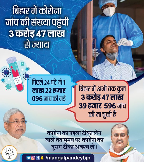 Patna : Active cases dropped to  782 in Bihar even as 102 more persons tested positive for Covid-19 on July 12, 2021, up from 72 on the previous day. Active cases count in Bihar was 788 on July 12. The state did not report any death due to Covid-19 in last 24 hours and the toll remained pegged at 9,619 in the state on July 13, 2021.