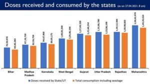 Recently some media reports, quoting some government officials from Maharashtra, have pointed out that the vaccine in the State are finished thereby adversely impacting the vaccination drive in the state. It is clarified that the total Covid vaccine doses received by Maharashtra as on April 27, 2021 (at 8 am) are 1,58,62,470. Of this, the total consumption including wastage (0.22%) was 1,49,39,410. Balance of 9,23,060 doses is still available with the state for administration of vaccine doses to the eligible population groups. Furthermore, 3,00,000 doses of Covid vaccine are in the pipeline for delivery in the next three days, according to a PIB release.