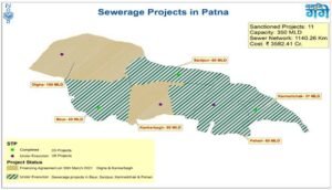 Under the Namami Gange programme, in Patna, 11 sewerage schemes for development of sewage treatment capacity of 350 MLD along with laying of 1,140.3 km sewerage network has been taken up at a total cost of Rs 3,237 Crore. STP projects in Beur (43 MLD) and Karmalichak (37 MLD) are completed and were inaugurated by the Prime Minister in 2020. Another STP project at Saidpur (60 MLD) and adjoining network has been completed recently. STP projects are also sanctioned for towns adjoining Patna namely Danapur, Phulwarishariff, and Fatuha.