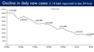 New Delhi : India on June 6, 2021, reported 1,14,460 new Covid-19 Cases in the last 24 hours, the lowest in the last two months, taking the tally to 2,88,09,339 in the country on June 6, 2021. The country has recorded less than 2 lakh Daily New Cases for 10 continuous days now. India logged 2,677 new deaths deaths due to Covid-19 in last 24 hours taking the toll to 3,46,759 in the country on June 6, 2021.