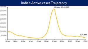 The Active Caseload dropped to below 2 lakh mark in India and was 1,95,846 on October 17, the lowest in 220 days. Active cases presently constitute 0.57% of the country’s total Positive Cases.