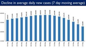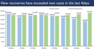 New Delhi : India logged 2,81,386 new Covid-19 cases in last 24 hours, down from 3,11,170 cases on May 16, 2021, taking the tally of cases to 2,49,65,463 in the country at 8 am on May 17, 2021. In a major development, a total of 3,78,741 Covid-19 patients were declared cured / discharged in the country in last 24 hours, up from 3,62,437 on May 16, taking the tally to 2,11,74,076 on May 17, 2021. The country also recorded 4,106 new deaths due to Covid-19 in last 24 hours taking the tally to 2,74,390 on May 17, 2021. The recovery rate (RR) of Covid-19 patients improved to 84.81% in India on May 17 from 84.25% on May 16, 2021.