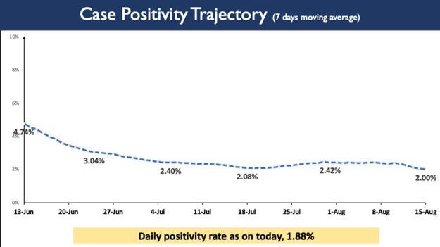 India’s Active Caseload was 3,85,336 on August 15, 2021, a drop of 2,337 cases in last 24 hours. Active cases now constitute only 1.20% of the country’s total Positive Cases. The Weekly Positivity Rate was 2.00% while the Daily Positivity rate was 1.88% on August 15. Daily Positivity rate has remained below 3% for last 20 days and below 5% for 69 consecutive days now.