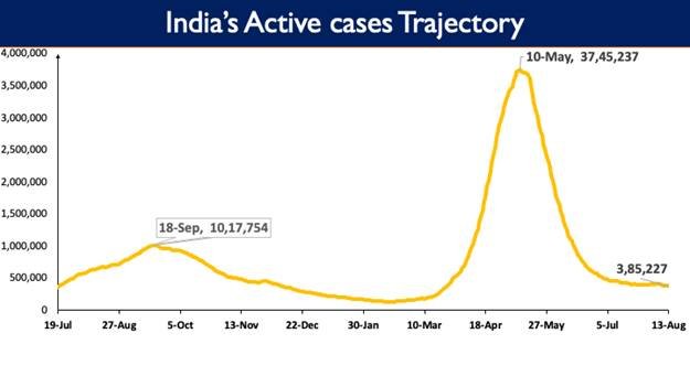 India’s Active Caseload was 3,85,227 on August 13, 2021, a drop of 2,760 cases in last 24 hours. Active cases now constitute only 1.20% of the country’s total Positive Cases, the lowest since March 2020. Weekly Positivity Rate was 2.13% while the Daily Positivity rate was 2.04% on August 13. Daily Positivity rate has remained below 3% for last 18 days and below 5% for 67 consecutive days now.