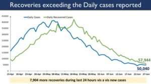 On the other hand, a total of 57,944 Covid-19 patients were declared cured / discharged in last 24 hours taking the tally to 2,92,51,029 in the country on June 27. Daily recoveries continued to outnumber the Daily New Cases for the 45th consecutive day on June 27. Altogether 7,904 more recoveries were reported during the last 24 hours as compared to the daily new cases.