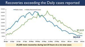 As more people are getting recovered from Covid-19 infection, India’s Daily Recoveries continued to outnumber the Daily New Cases for 38 consecutive days on June 20, 2021. A total of 87,619 recoveries were registered in the last 24 hours taking the tally to 2,87,66,009 on June 20. A total of 29,200 more recoveries were reported during the last 24 hours as compared to the daily new cases, according to a PIB release.