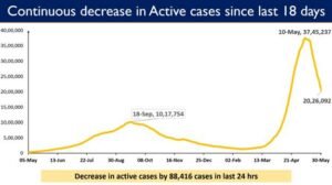 India has been witnessing a continuous fall in the active caseload. The Active Caseload further dropped to 20,26,092 active cases in the country on May 31, 2021, a net decline of 88,416 in last 24 hours. Active cases accounted for only 7.22% of the country’s total Positive Cases ( 2,80,47,534), according to Union Health Ministry figure.