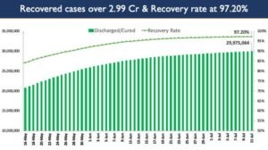 On gthe other hand, altogether 41,526 Covid-19 patients were declared cured / discharged in last 24 hours taking the tally to 2,99,75,064 on July 11, 2021. Out of the people infected since the beginning of the pandemic, 2,99,75,064 people have already recovered from Covid-19. This constitutes an overall recovery rate of 97.20% showing a sustained increasing trend, according to Union Health Ministry figure.