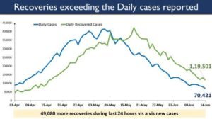 As more people are recovering from Covid-19 infection, India’s Daily Recoveries continue to outnumber the Daily New Cases for 32 consecutive days now. A total of  1,19,501 recoveries were registered in the last 24 hours. Altogether 49,080 more recoveries were reported during the last 24 hours as compared to the daily new cases on June 14, 2021.