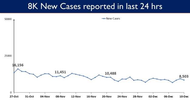 New Delhi : For the second consecutive day, the detection of new Covid-19 cases exceeded the recoveries on December 10, 2021. India logged 8,503 new Covid-19 cases in last 24 hours. Less than 15,000 Daily New Cases have been reported for the last 43 days now.