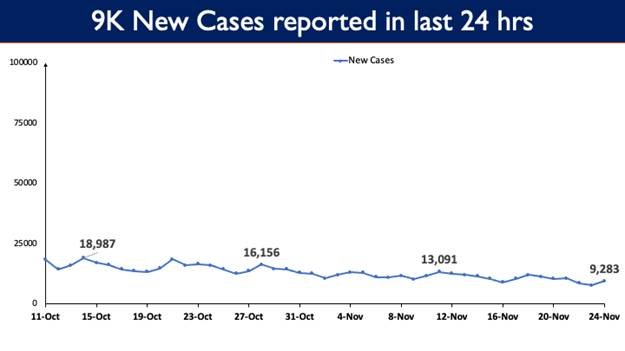 New Delhi : India reported 9,283 new Covid-19 cases in last 24 hours, up from 7,579 cases on November 23, 2021. Sustained and collaborative efforts by the Centre and the States/UTs continue the trend of less than 50,000 Daily New Cases being reported for 150 consecutive days now.