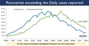 As more patients are recovering from Covid-19 infection, India’s Daily Recoveries continued to outnumber the Daily New Cases for the 28th consecutive day on June 10, 2021. A total of 1,51,367 recoveries were registered in the last 24 hours. in the country on June 10 taking the tally to 2,76,55,493. Altogether 57,315 more recoveries were reported during the last 24 hours compared to the daily new cases, according to union Health Ministry figure.