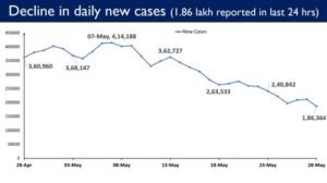 New Delhi : Recoveries continued to outnumber the daily new Covid-19 cases in India for 15th consecutive day on May 28, 2021. India logged a total of 1,86,364 new Covid-19 cases in last 24 hours, down from 2,11,298 cases the previous day, taking the tally of cases recorded so far in the country to 2,75,55,457 at 8 am on May 28, 2021. At 1.86 lakh Cases, Daily New Covid-19 Cases are lowest in last 44 days. It is less than 3 lakh Daily New Cases for 12 consecutive days.