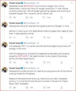 Goyal said that Centre is in daily touch with State Governments to assess their needs and help them in best possible manner. He also said that just yesterday ( April 16), the Prime Minister, in his review, told that centre and states should work with synergy in this crisis. Expressing sadness over politics being played by the state Government over the issue, Goyal said that Maharashtra has so far received the highest quantity of Oxygen in India, according to a PIB release.