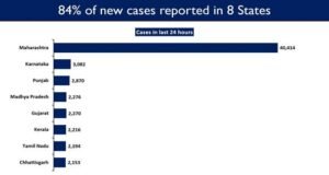New Delhi : Eight States : Maharashtra, Karnataka, Punjab, Madhya Pradesh (MP), Gujarat, Kerala, Tamil Nadu (TN), and Chhattisgarh have reported high number of COVID daily new cases. 84.5% of the new cases are reported from these 8 states. 68,020 new cases were registered in the last 24 hours. Maharashtra reported the highest daily new cases at 40,414 in last 24 hours.  March 29, 2021. It is followed by Karnataka with 3,082 while Punjab reported 2,870 new cases.