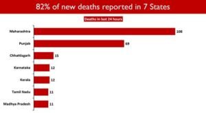 291 deaths were reported in the last 24 hours. Seven States account for 81.79% of the new deaths. Maharashtra saw the maximum casualties (108). Punjab follows with 69 daily deaths. Fifteen States/UTs have not reported any COVID19 deaths in the last 24 hours. They are : Assam, Uttarakhand, Odisha, Puducherry, Ladakh (UT), D&D & D&N, Lakshadweep, Manipur, Tripura, Sikkim, Meghalaya, Mizoram, A&N Islands, Nagaland,and Arunachal Pradesh.