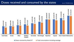 New Delhi : As part of the nationwide vaccination drive, the Government of India (GoI) has been supporting the States and UTs by providing them Covid Vaccine free of cost, in addition to several efforts to ramp up its production and supply. Vaccination is an integral pillar of the comprehensive strategy of Government of India for containment and management of the pandemic along with Test, Track, Treat, and Covid Appropriate Behaviour.