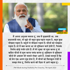 Terming this year’s interaction as first virtual edition of ‘Pariksha Pe Charcha’, the Prime Minister said that Corona has led to many innovations and despite the disappointment of not being able to be among the students face to face, there should not be a break in Pariksha Pe Charcha this year. He said that Pariksha Pe Charcha is not only a discussion on examination but also an occasion to talk, among family members and friends, in a relaxed atmosphere and create new confidence, according to a PIB release.