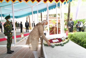 New Delhi : Prime Minister Shri Narendra Modi on the second day of his two-day visit to Bangladesh paid tribute at the Mausoleum of Bangabandhu Sheikh Mujibur Rahman in Tungipara. This marked the first ever visit by any foreign Head of State or Head of Government to pay homage at Bangabandhu Mausoleum Complex.